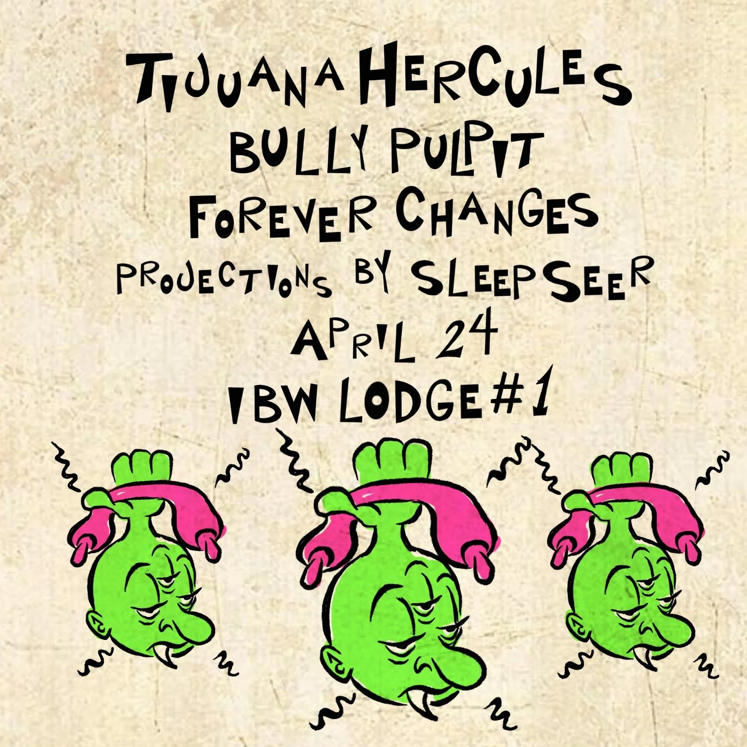 ITEM (!): Meanwhile - online ordering is nice and all - but nothing beats the post-pandemic pleasure of setting foot in a real live record store and scoring some instant gratification! These esteemed establishments below have all gone above and beyond by pledging their support to TIJUANA HERCULES' new album "Mudslod and the Singles" - - - and each will have a limited quantity of posters (hand silkscreened by the band's very own John Vernon Forbes) to do with what they will!